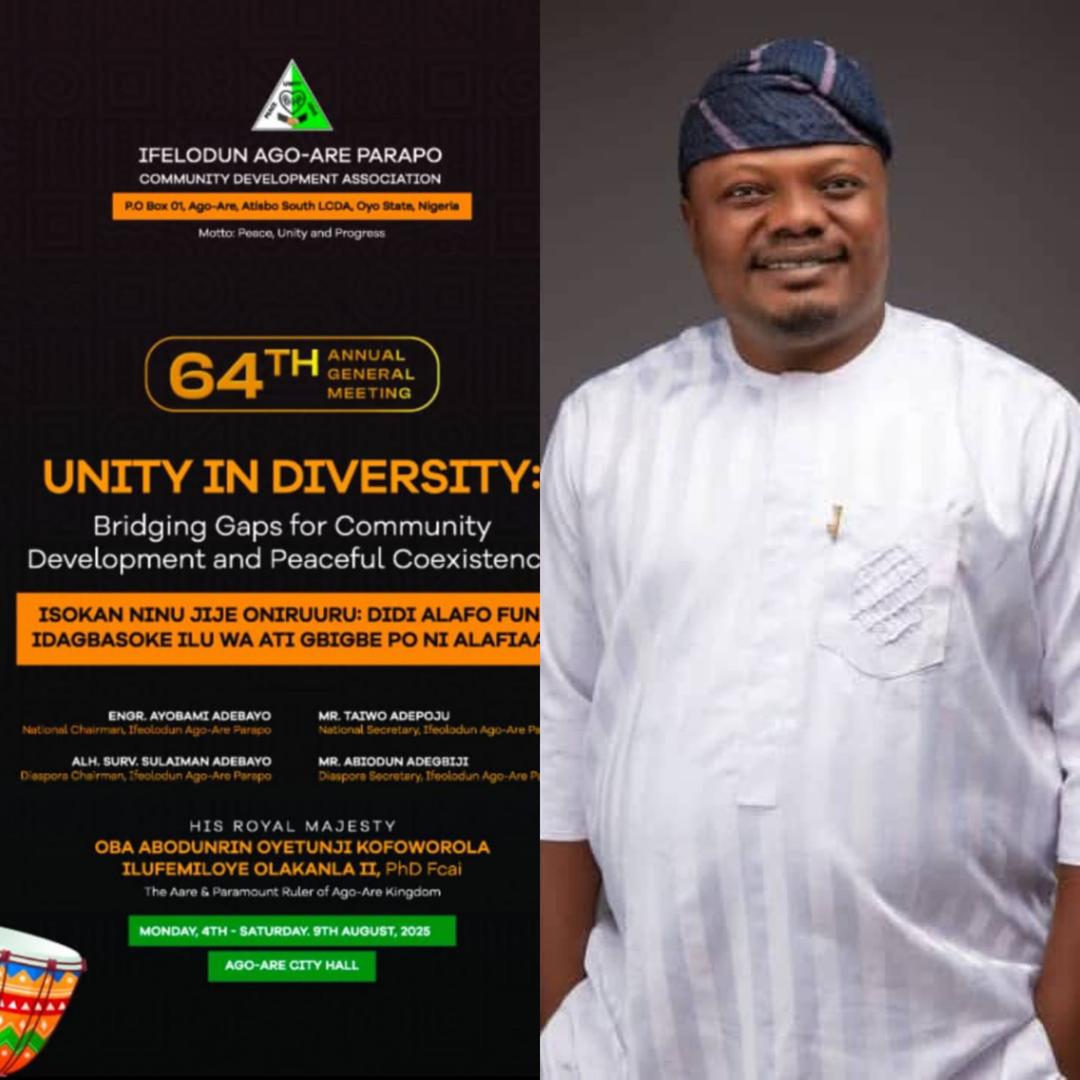 Engr. Tosin Kolade Awodi-Oke, Founder of Awodi-Oke Foundation and stalwart member of the All Progressives Congress, APC, congratulates HRM Oba Abodunrin Oyetunji Kofoworola and Ifelodun Ago-Are Parapo Community Development Association on their 64th anniversary, highlighting the occasion as a moment for communal reunion and renewal of hopes and aspirations.