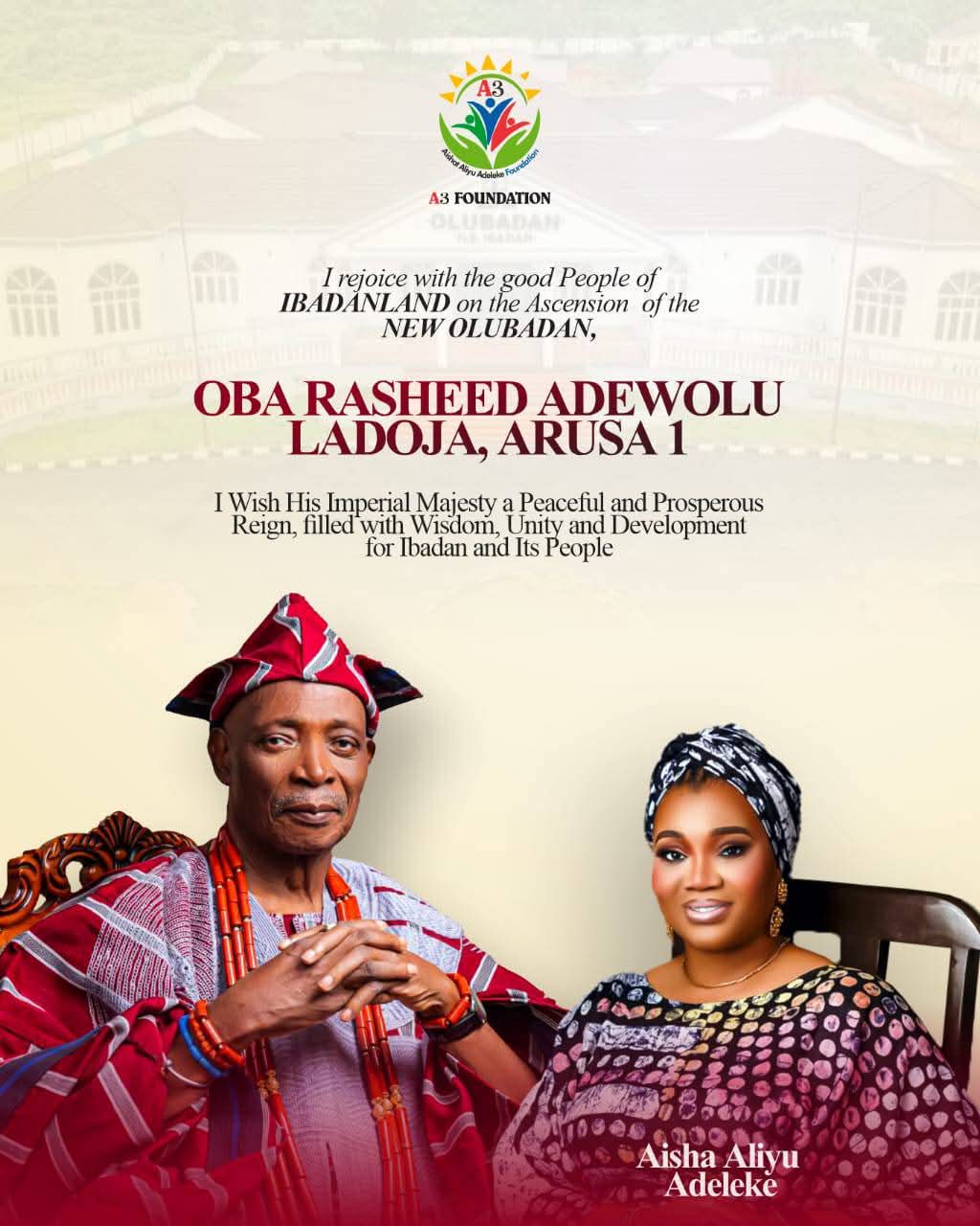 Adeleke, who is also the founder of Aishat Aliyu Adeleke Foundation (A3 Foundation), a non-governmental organization focused on food distribution and community development, called on the people of Ibadanland to rally around the new Olubadan with loyalty, respect, and collective support. She expressed optimism that Oba Ladoja’s reign would bring peace, unity, and accelerated development to every community under his influence.