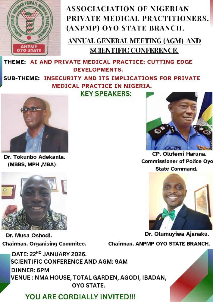 The Association of Nigerian Private Medical Practitioners (ANPMP), Oyo State Branch, is set to hold its Annual General Meeting (AGM) on January 22, 2026, at NMA House, Total Garden, Agodi, Ibadan. The event promises to be a significant gathering, focusing on the intersection of technology and healthcare.
